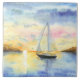 Sea at sunset. A cute yacht leaves the bay and goes to sea. The watercolor illustration was drawn and scanned. Watercolor Landscape made in the open air in 2024.