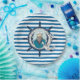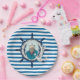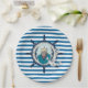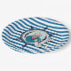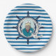 Bright blue and white horizontal pattern design paper plates features a nautical theme with sea captain, silver anchor, and ship wheel!
