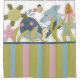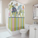 Girls who love bright colours and cute stick figures will adore this shower curtain featuring three stick figure girls, one with a pink umbrella, heart trees, and butterflies as well as a top border of bright turquoise blue and bottom of pink and white stripes.