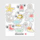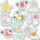 Sea critters: 13 different cartoon doodle sea animals including a starfish, crabs, octopus, shark, tiger shrimp, seahorse, jellyfish, dolphin, fish, stingray and whale.