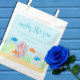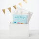 Sea life baby shower with orange and blue fish playing amongst a sandy reef of coral and seaweed, amidst ocean bubbles.