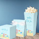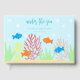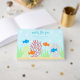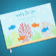 Sea life baby shower with orange and blue fish playing amongst a sandy reef of coral and seaweed, amidst ocean bubbles.