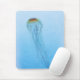 A watercolor painting of a jellyfish, with a colourful top, in the big, open, blue ocean.