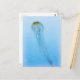 A watercolor painting of a jellyfish, with a colourful top, in the big, open, blue ocean.