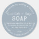 Elegant dusty blue soap sticker designed for handmade soap businesses. Featuring a clean round design with customisable ingredients list (saponified oils of olive oil, coconut oil, shea butter, sea salt, sage essential oil), weight, business name, and website. Perfect for coastal, spa-inspired, or natural skincare packaging.