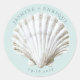 This sticker has a watercolor image of a white sea shell with the bride and groom's name and wedding date. Colours used include, slate blue, forest green, ivory and tan.