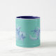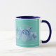 This combo mug has an tropical aqua-blue background over white with blue-tone sea shells images across the exterior of the mug from side to side. Coordinating deep blue handle and interior. Buy as shown or customise to your preference.