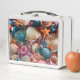 This lunch box has sea shells on it.