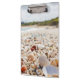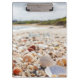Let your mind drift as you think about the beach and collecting sea shells. Many sea shells in the sand along the shoreline. Crisp blue water and a row of tree's on other side of lake.