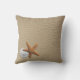 A group of sea shells, star fish and sand dollar sit on the soft beach sand. A perfect pillow for the beach cottage look.