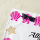 Personalise black script name with pink sea shells and gold starfish on white background.