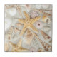 A vibrant collection of seashells and a starfish scattered across a sandy surface.