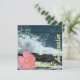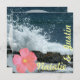 Tropical beach save the date with waves splashing against the shore, coral pink hibiscus and fun bold text. Perfect way to announce an upcoming destination wedding by the sea.