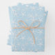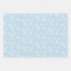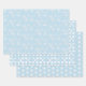 Baby blue sheets of gift wrapping paper with sea life designs. White starfish, or sea stars, make a pattern on the first sheet. The next has shells and flowers and the third has small sand dollars. All patterns are white over light, blue-grey which is perfect for wrapping baby gifts, birthday presents, or gifting at weddings and showers.
