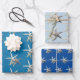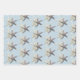Starfish wrapping paper sheets in shades of blue. Three sheets of paper with patterns of starfish, or sea stars in white off-white and brown over pretty blue colours. Teal blue, pale blue and navy blue backgrounds. Sheets have lines on the back to make cutting easier, or use each large size sheet to wrap a big gift.