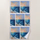Waves hitting the shore form a gentle foam, and the shades of blue sky are intermingled with the warm colours of the rising sun.