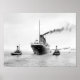 Titanic leaves the port of Belfast and heads to sea for her trials. She is accompanied by a flotilla of steam tugs. Note the Red Ensign flying from her stern.