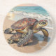 A coastal themed coaster with an illustration of a mama sea turtle and baby crawling into the blue ocean waves on a sandy beach.