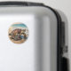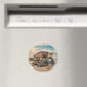 Coastal themed magnet with an illustration of a mama sea turtle and baby crawling into the blue ocean waves on a sandy beach.