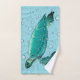 Bathroom towel set with images of sea turtle against a seafoam coloured background with bubbles.