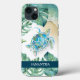 This custom phone case features a watercolor sea turtle, shoreline and tropical monstera palm leaves. Personalise with your name in white over a navy blue background. Artwork and design by Victoria Grigaliunas. To see more sea life and beachy phone cases like this visit www.zazzle.com/dotellabelle
