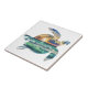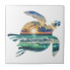 A digital art design of a beach at sunset with turquoise waves framed in a sea turtle .