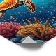 Sea Turtle Underwater- A vibrant underwater scene features a large sea turtle swimming gracefully through a turquoise and blue ocean. The turtle's carapace is a beautiful orange and brown, with intricate patterns. Sunlight streams down from above, creating a shimmering effect in the water. Small, yellow fish swim around the turtle, adding to the lively atmosphere