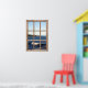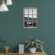 Poster that looks like a window -- waves and coast Create an instant sea view in any part of your home or office with this picture that looks like a window. The scene of the ocean shows a wave cresting as it rolls in to the shore. In the distance is a little seaside village and green hills. Above the sea is a cloudless blue sky. The view is surrounded by a wooden window frame. This is a calming image that brings the ocean to you no matter where you are.