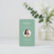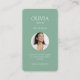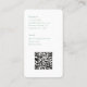 Modern and stylish business card featuring a QR code for social media, photo, tagline, enquiry details and social media links. Primary colours used in template are seafoam green and white. This versatile all-in-one-template can easily be updated. Replace circle photo with own profile photo or company logo. Your image will be adjusted automatically to fit into a circle shape. The design has a fresh & chic look and feel.