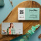 White, black, and seafoam green business card for any profession with your social media information in the form of your personal QR code and, on the back, a photo. Content creator business card with a charming brush script, seafoam green accent colour, cute social media icons, and your QR code.