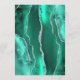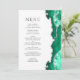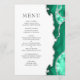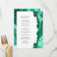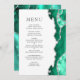 The right-hand edge of this elegant modern wedding menu features a seafoam green watercolor agate border trimmed with faux silver glitter. The customisable text combines charcoal grey Roman serif and copperplate fonts on a white background. The reverse side features a matching seafoam and silver agate design.