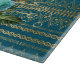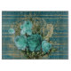 Dramatic and luxurious digital art collage features seafoam tinted roses with greenery and gold on peacock inspired patterned background.