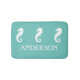 Three white seahorses bounce along through the seafoam teal green water over your customised family name or other text on this marine creature nautical bathmat. Matches ceramic knobs so you can really pull together your bathroom decor. Text is easily changed with the handy template tool on the product page. Customise your colours, fonts, add images, and more by clicking on the customise button below the image. I used my most popular colours and nautical symbols to make several different combinations already. This bathmat has a matching shower curtain here: