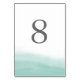 Beachy chic table number cards in soft shades of seaglass green and white feature a watercolor wash at the bottom that evokes the ebb and flow of the tide, with your table number in medium grey. Design repeats on reverse side. Coordinates with our Seaglass Tides wedding invitation suite.