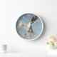 Stylish wall clock with white numerals that features a photo image of a grey and white Glaucous-winged Seagull in flight. Use to decorate a kitchen, living room, dining room, or any other room. Select your clock style and size along with hand colour.