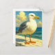 Send coastal vibes with this charming seagull postcard featuring beautiful oil painting artwork. The elegant white seagull with bright yellow beak and orange legs, standing gracefully on a dock against turquoise ocean waters, captures the peaceful essence of beach life in every detail.