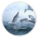 Seagulls flying over the sea, in tones of blue, white and grey with touches of complementary gold.