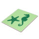 Mixed media digital rendition of a seahorse and starfish in deep emerald green against a light lime green background