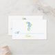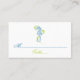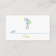 Seahorse and seaweed blue, green wedding seating place seating card that features a blue seahorse and lime green seaweed on white background. This whimsical template design is part of a wedding set perfect for a summer beach wedding. It is completely customisable.