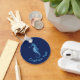 Stylised blue icon of a seahorse. Custom background colour. Custom text on both sides.
