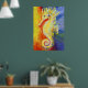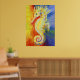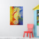 Bright and whimsical seahorse rendered in yellow, red, and blue is from an original oil painting by Jenny Speckels.