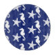 Mixed media digital rendition of a seahorse and starfish in white against a dark navy blue background