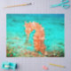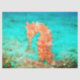 Beautiful translucent orange seahorse against turquoise ocean water. Colours of blue, turquoise and orange.