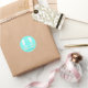 Stylish round beach theme wedding sticker, with graphics of two white sea horses facing each other, on an aquamarine background. Black script text is ready to personalise. Lovely finishing touch to our Seahorses Modern wedding invitations.