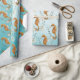 A nautical wrapping paper featuring watercolor painted seahorses with coral and seaweed against a Caribbean turquoise blue ombre background.