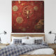 An ornate emblem glows in gold against a textured crimson backdrop, surrounded by arcane symbols and cryptic inscriptions.