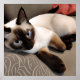 Poster in an illustration of a beautiful seal point Siamese cat lounging on a couch, rendered as a digital watercolor effect portrait