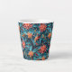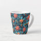 A beautiful latte mug with a seamless paper floral pattern against a blue background.