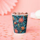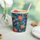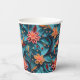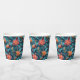A beautiful set of paper cups with a seamless paper floral pattern against a blue background.
