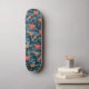 A beautiful skateboard with a seamless paper floral pattern against a blue background.